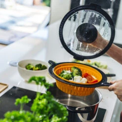 Das Functional Form Nudelsieb der Marke Fiskars hat ein durchdachtes Design, welches sich falten lässt und somit fast keinen Platz in der Küche einnimmt. Das Sieb kann zudem auch als Damp Einsatz verwendet werden und der zusätzliche Griff erleichtert das Herausnehmen des Siebes aus dem Kochtopf.